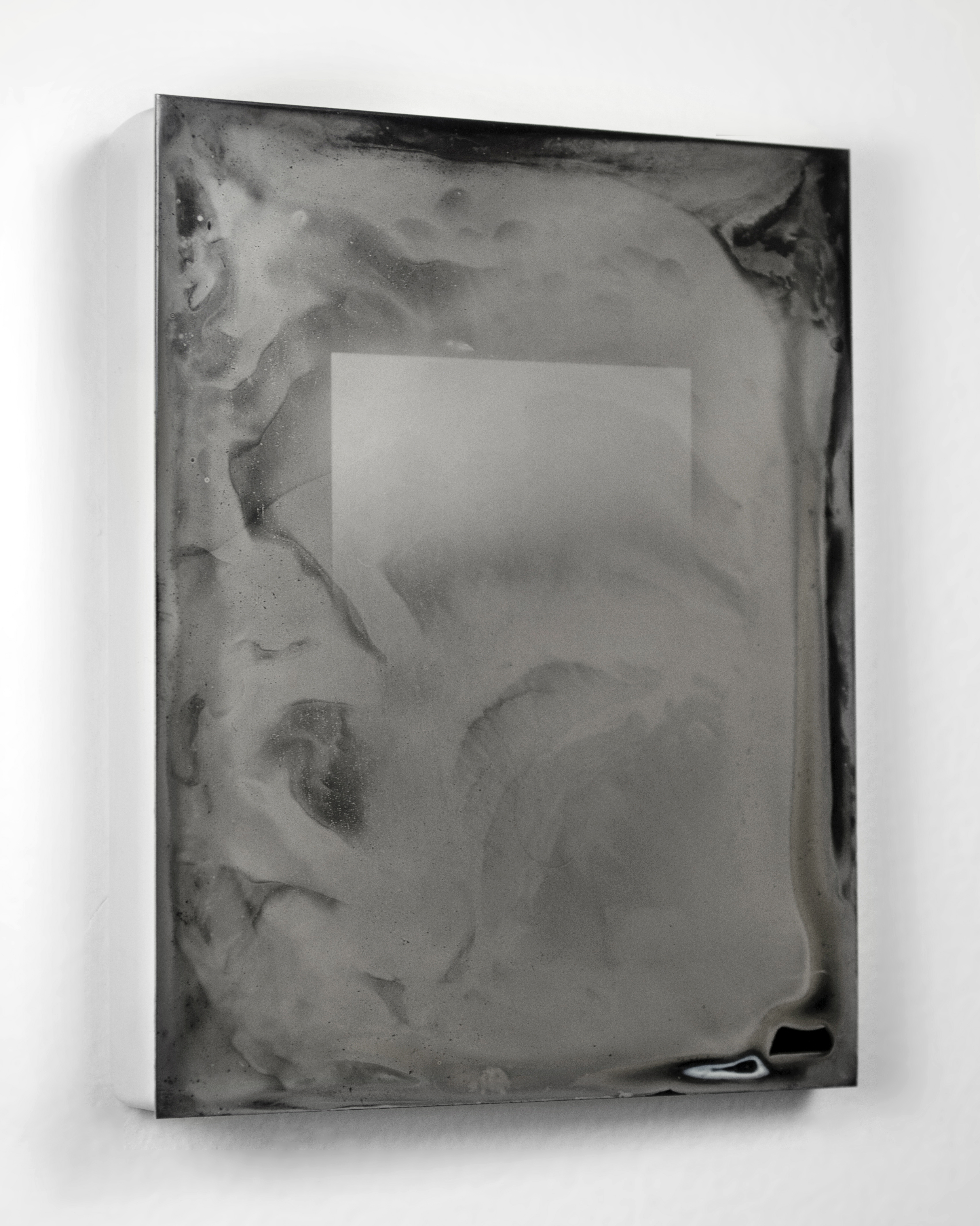 Tintypes are created as direct positives on thin metal sheets coated with enamel and then collodion. This studio technique enjoyed its widest use in the 1860s and 70s, when it was applied to produce small-scale photographic portraits for people to carry in their pockets, but also to document the American Civil War. Between nostalgia and novelty, the resuscitation of this procedure could be said to forfeit approaches of abstraction in photography, reverting instead to aesthetics of classical representation. In her Tintype series, Combining analog with digital photography, Nelson generates abstract shapes on dark backgrounds that appear to have oozed out of a science fiction narrative. Her plates are exceptionally large and exceed the portable scale of traditional tintypes. The prints are mounted on triangular volumes that lift them out from the wall, distorting the boundaries between picture plane and physical space of the viewer.”